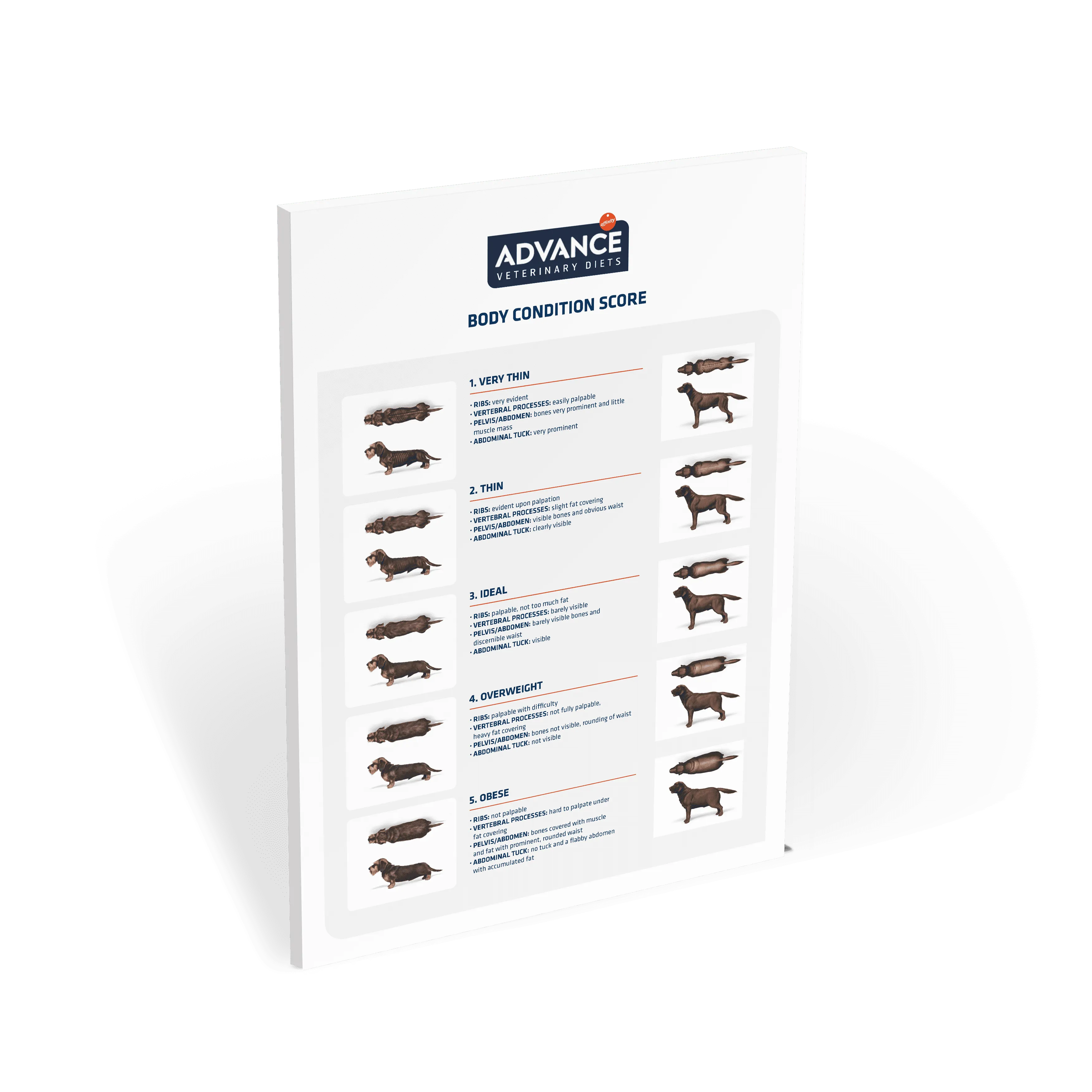The poster is a very useful tool that allows a very visual orientation of the animal's body condition. It consists of a scale from 1 to 5 which distinguishes various stages between "very thin" and "obese".
