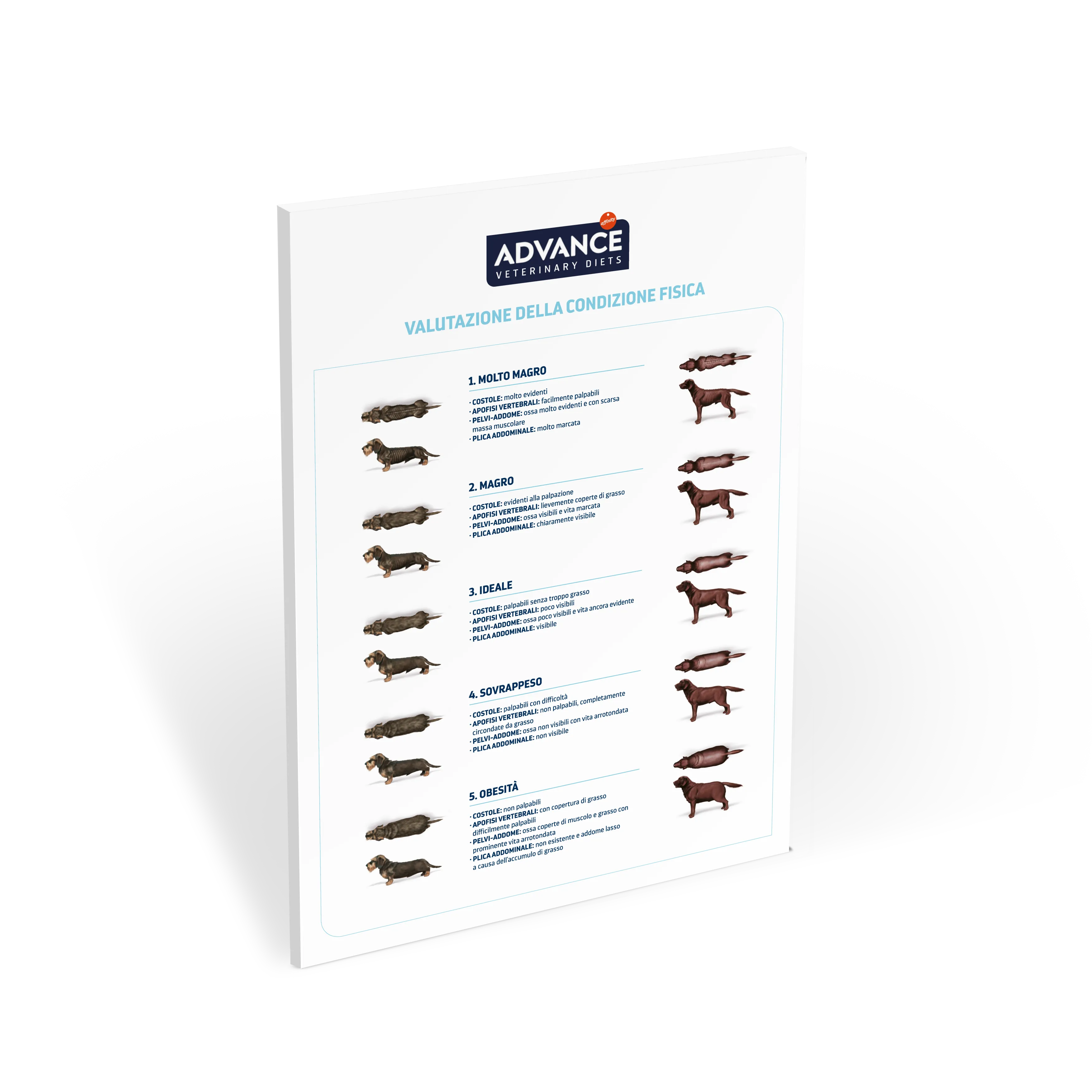 Il poster è uno strumento molto utile che consente di avere un’indicazione di massima estremamente visiva in merito alla condizione fisica dell’animale. Contiene una scala da 1 a 5 che distingue vari stadi, da “molto magro” a “obeso”.