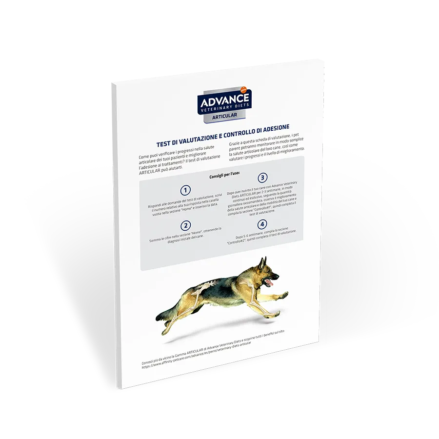Con questa scheda di valutazione il proprietario del cane può facilmente monitorare lo stato di salute articolare del proprio animale e valutare i progressi e il livello di miglioramento.