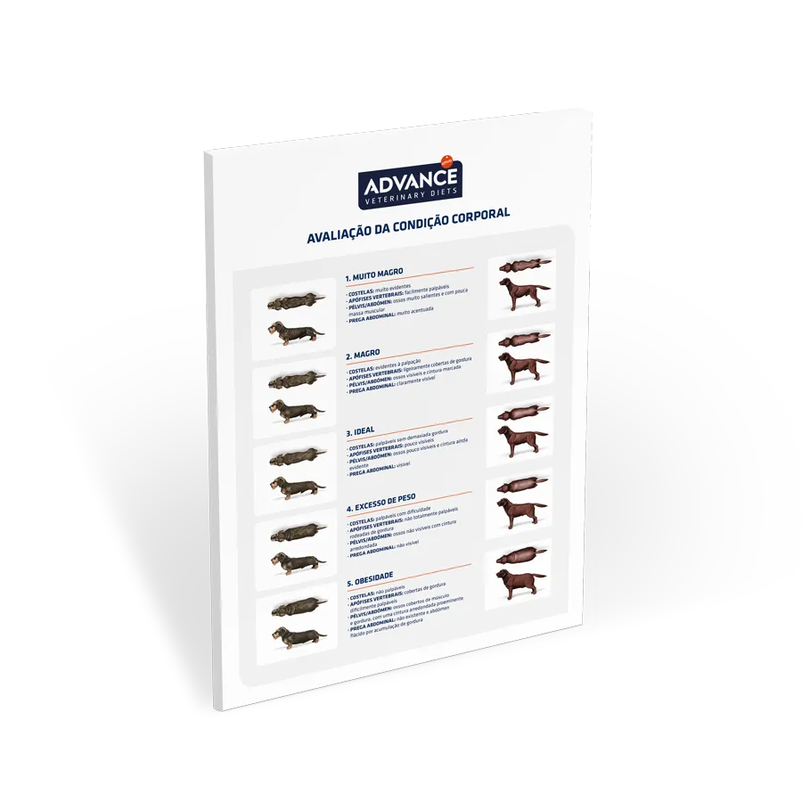Contém ilustrações orientadoras sobre o estado corporal que permitem explicar facilmente ao dono o estado corporal em que se encontra o seu animal.